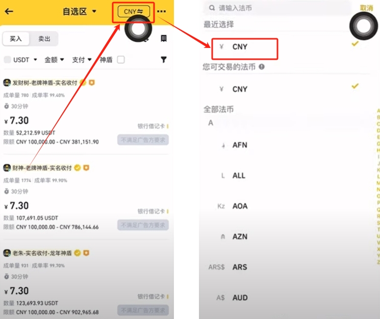 右上角的CNY 就是人民币的意思,就是我们要使用的法币,可以切换你要使用的法币,我们就直接选择CNY人民币就好。