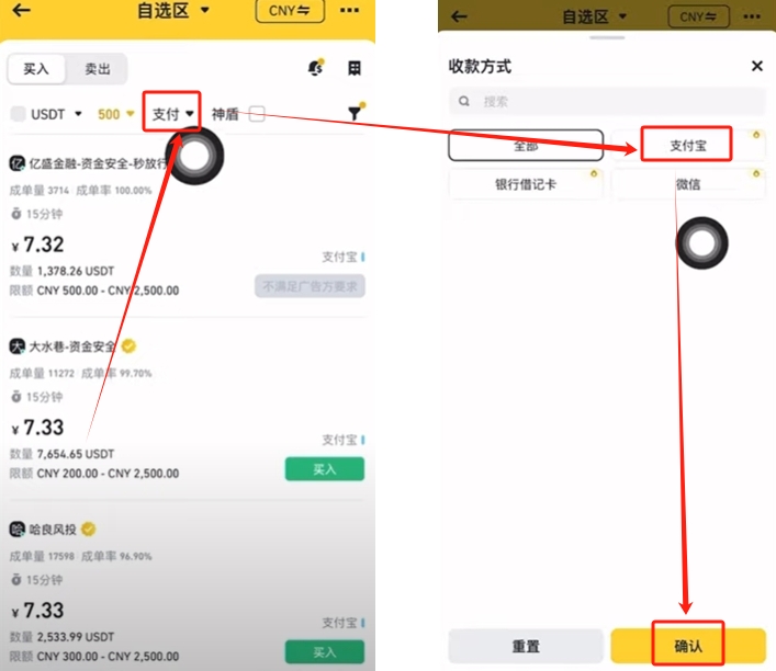 币安就会为我们筛选一下商家,然后我们选择一些支付方式。点击【支付】,它有三种支付方式,支付宝、银行卡还有微信支付。你习惯使用哪种支付方式就使用哪种方式支付。比如说你习惯使用支付宝。就选择【支付宝】,点击【确认】