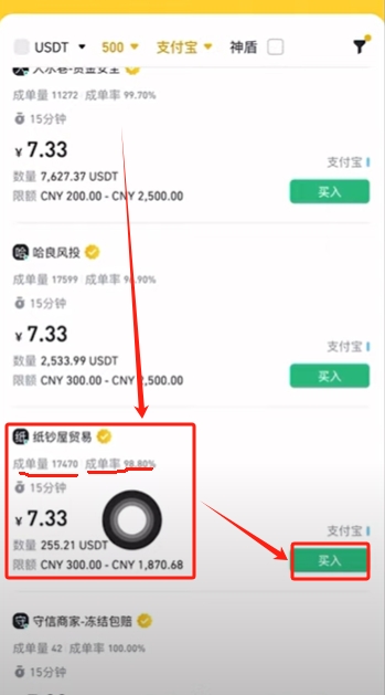这时币安就会按照我们的金额和支付方式给我们匹配好商家。我们要找成单量和成单率多的商家来进行购买。因为成单量和成单率高的那帮人,他们是最好的。就相当于是他们是比较有实力的一些商家。最低要挑选成交量大于3000,成单率大于98%的商家。他整个的排价顺序都是由低到高的。因为我们想买入,所以当然想去购买价格便宜的。