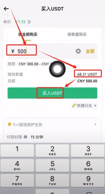再次输入一下我们要购买的金额。输入完之后,下面就会自动帮我们算出来,支付500人民币将收到68.21颗USDT。