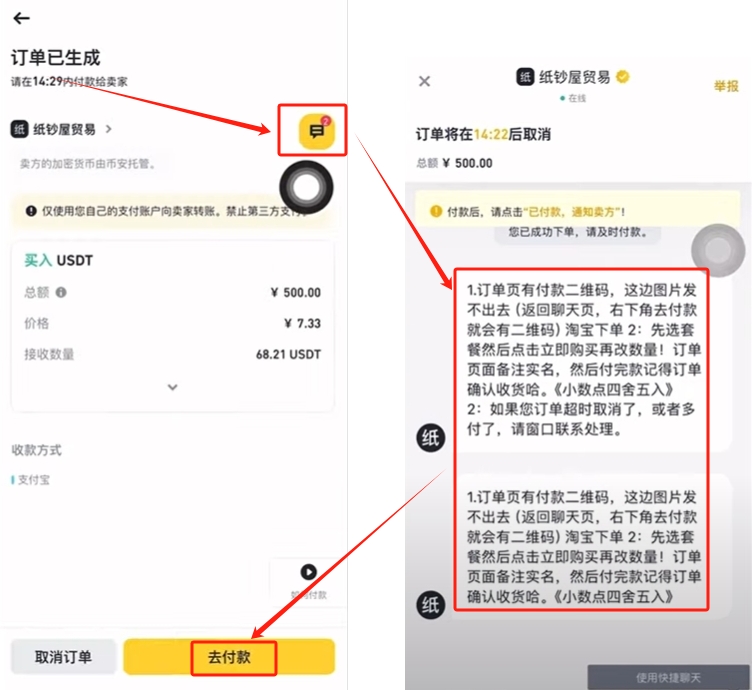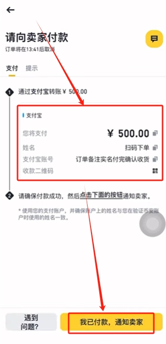 根据商家提供的支付方式给他转钱,转完钱之后点击【我已经付款,通知卖家】,请他把数字货币放给我们。