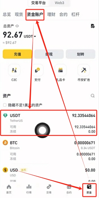 我们购买好的USDT都会在资金账户里面。点击右下角的【资金】,上方选择【资金账户】在这里就可以看到我们购买好的USDT了。