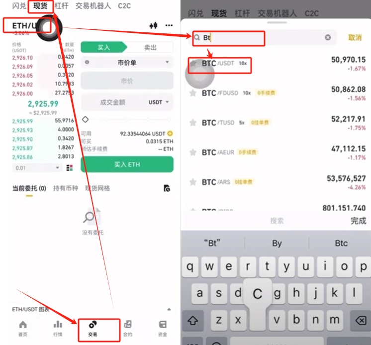 我们把钱划转到现货账户之后,就可以去进行交易了。点击下方中间的【交易】按钮,在上方选择【现货】,选择要购买的币种,如搜索ETH并选择第一个ETH/USDT,这代表你用USDT来购买以太坊。同样的如果你想兑换其他的币,都可以在这里搜索。然后使用USDT来进行兑换。
