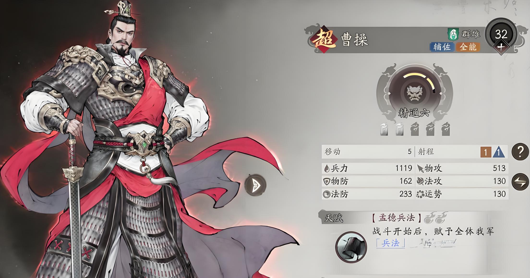 2、曹操属团队增益辅助,乱世奸雄技能给全队加15%全属性,搭副将卞氏额外提群体攻击力,亲兵系统助快速解锁技能。