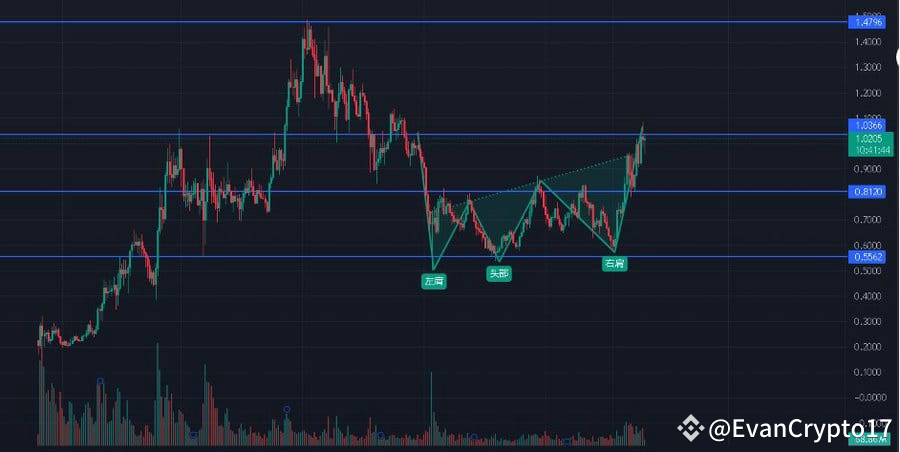 从今年的 8 月份到 11月份,ONDO 价格一直在 0.5 的支撑位和 0.8 的压力位区间内震荡,随后 11 月份价格突破 0.8,然后迅速回踩 0.8 又形成突破之势,目前价格 1.01 为前期高点阻力位。