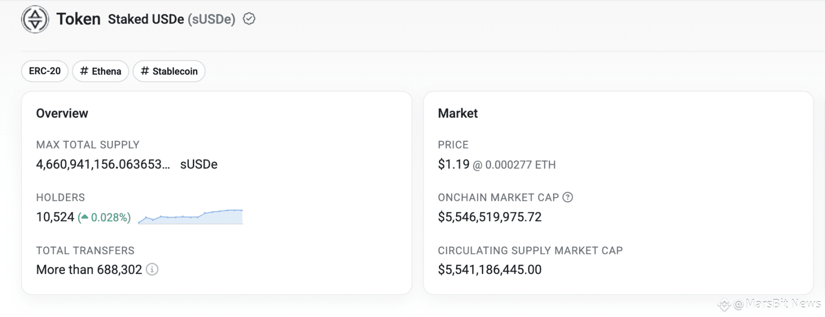 这家交易公司叫作 Ethena。你每存入 1 美元资金,都会收到 1 个 USDe 作为存款凭证。基金产品叫 sUSDe,目前已发行超 46 亿份,每 1 份 sUSDe 的净值为 1.19 美元。