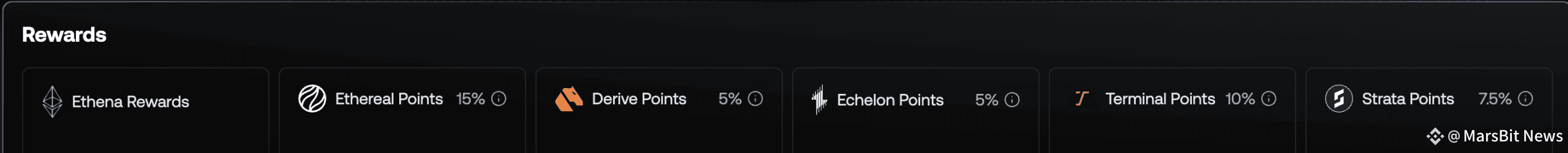 质押 ENA 代币可获得 sENA 代币(解质押需要 7 天),除质押本身可忽略的年化利率外, sENA 代币还可以获得 Ethena 自身的积分奖励和众多生态项目的积分奖励。这些项目均已承诺一定的自身代币给 sENA 代币质押者,包括 Ethereal(15%)、Derive(5%)、Echelon(5%)、Terminal(10%),Strata(7.5%),后文将会展开介绍其中几个项目。