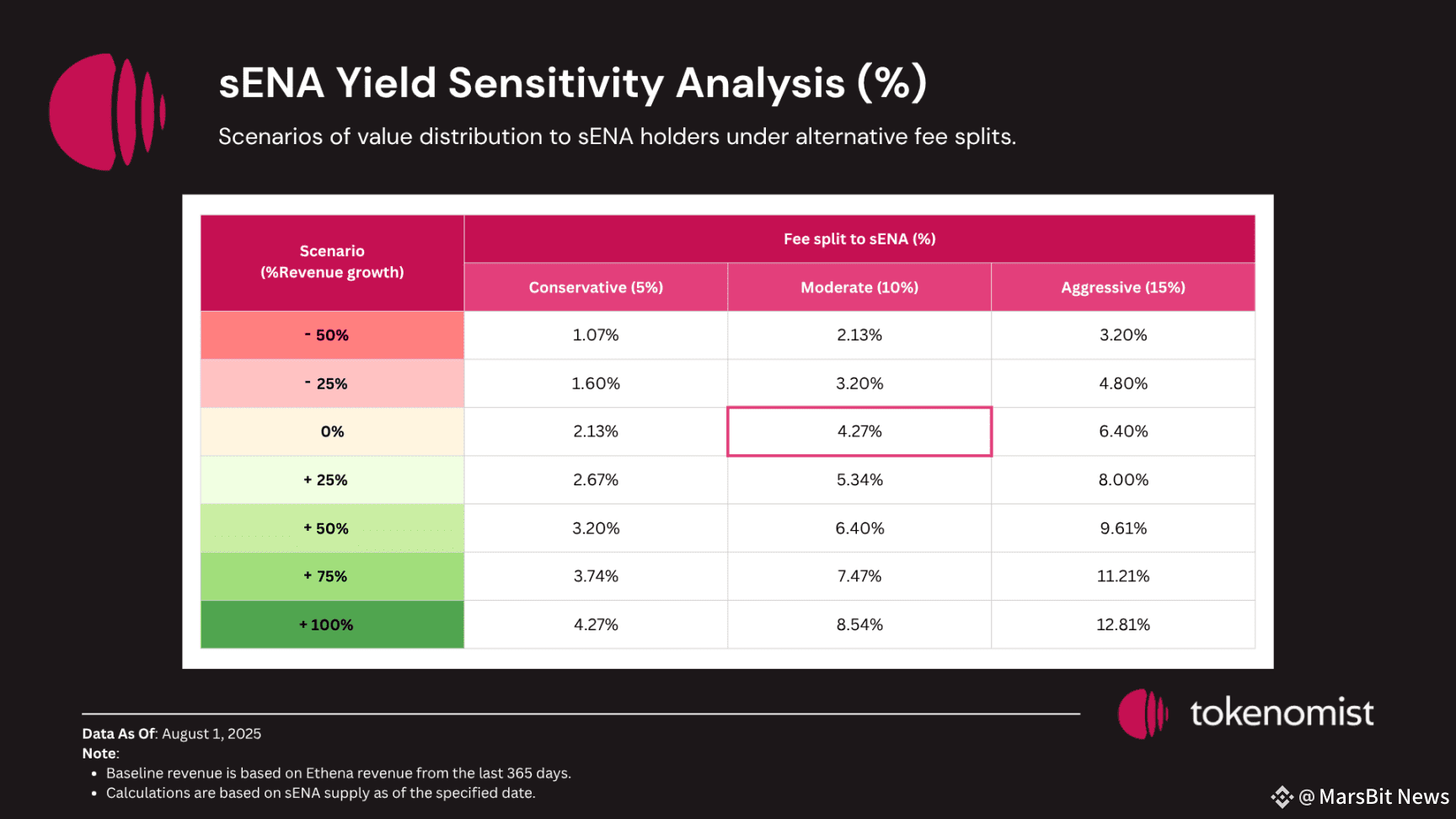 sENA 的潜在收益率受 Ethena 的收益增长情况和实际的分成比例影响,根据 tokenomist 的计算,在最恶劣情况下和最理想情况下的收益率分别为 1.07% 和 12.81%。