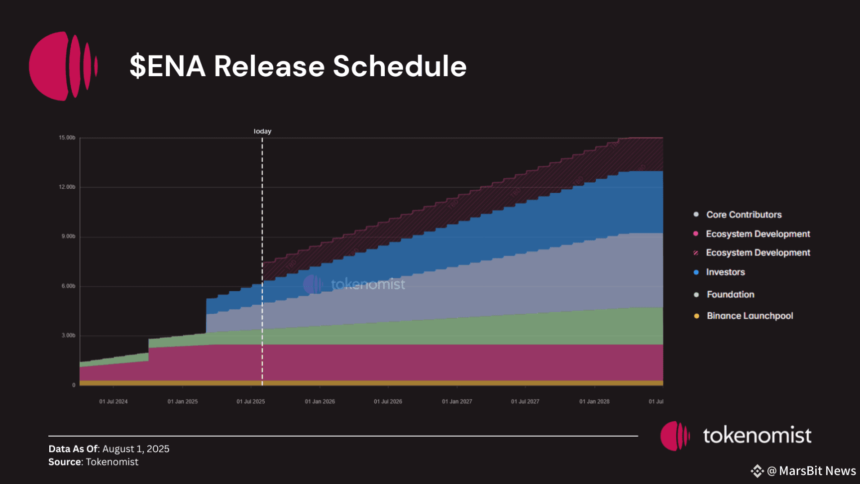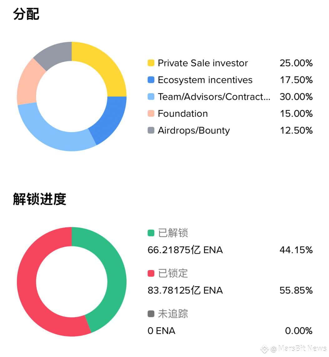 ENA 代币总量为 150 亿枚,其中约 66 亿枚已解锁,而 sENA 此刻的流通量仅为 9.1 亿枚。除稀释潜在收益率外,这里还引出了 ENA 的另一个问题 —— 解锁抛压。
