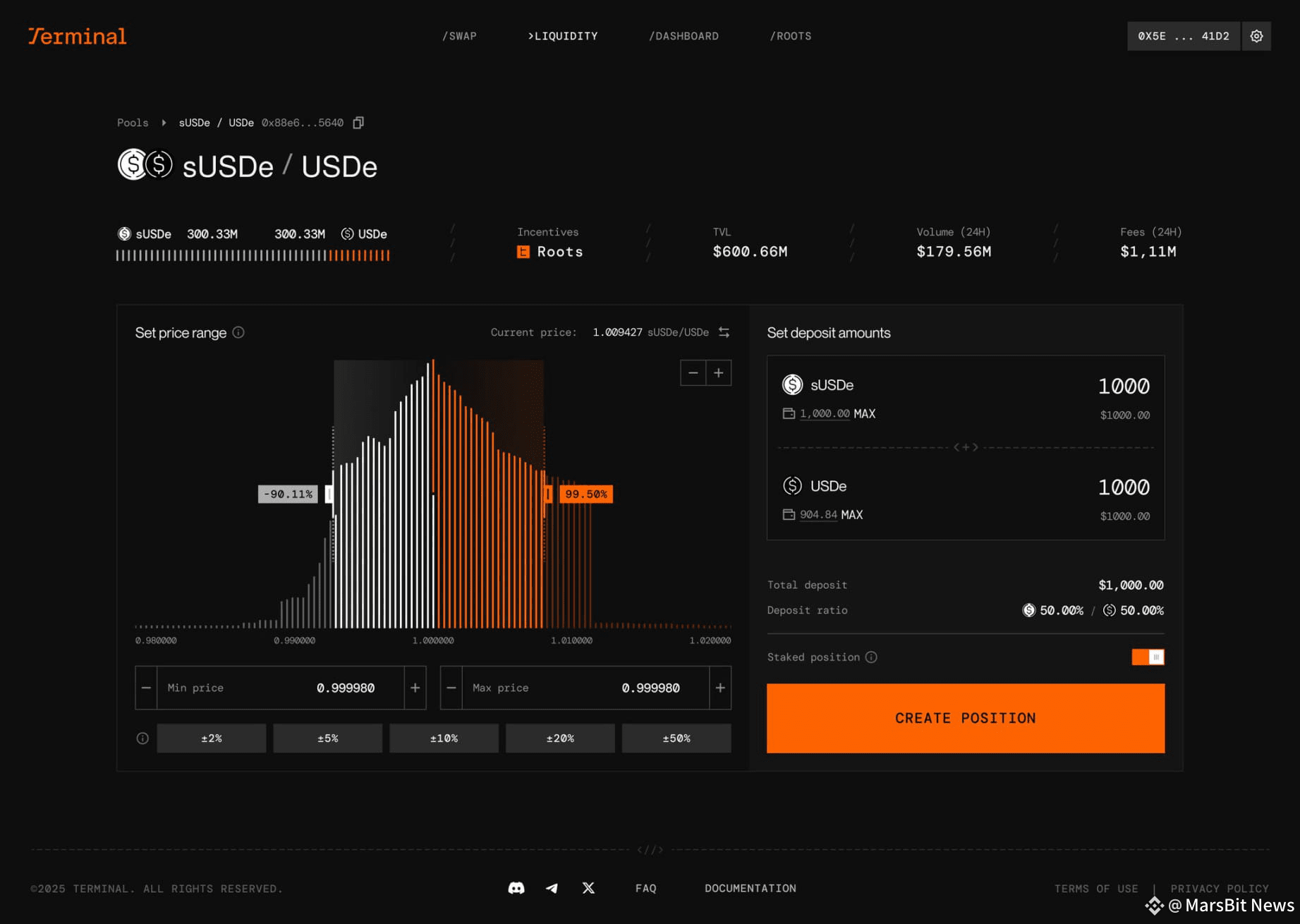Terminal 提出的问题是:当前以 sUSDe 为代表的「带收益稳定币」缺乏高效的二级市场,导致大额交易存在流动性不足的痛点。为此,Terminal 旨在构建以 sUSDe 为核心的现货 DEX,提供稳定币与机构资产之间的高效交易通道。