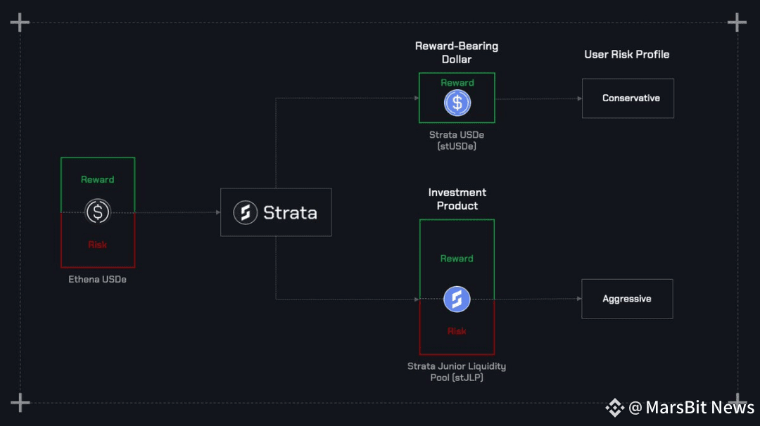Strata USDe(stUSDe):作为优先级(senior)产品,提供更稳定的回报和本金保护,适合偏保守的投资者。其收益来源于 sUSDe,同时保证最低 APY,并具备一定的上行敞口。