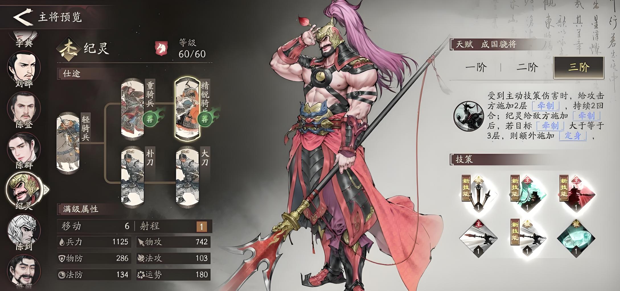 3、纪灵满级属性移动6、射程1,兵力1125、物攻742,统率成长1点99接近白板曹操,玩武锋阵带抚辑军民堆高治疗量,前期带则浪费资源。