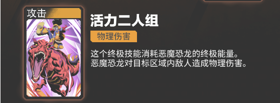 4、终结技活力二人组消耗恐龙终极能量,使其对目标区域敌人造成高额物理伤害,该技能伤害系数最高,推荐装配加攻击力神器增强效果。