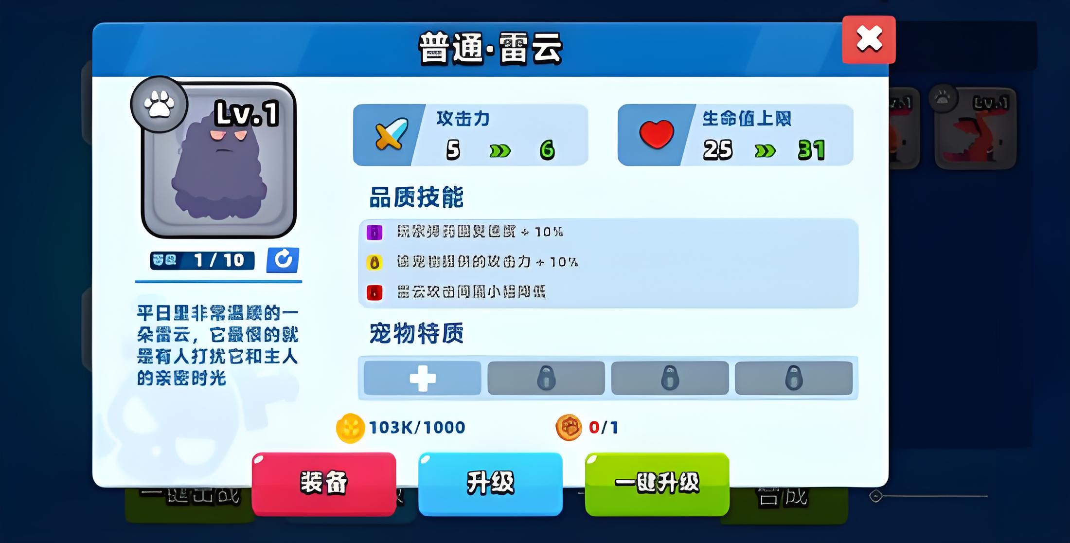 3、雷云适配速攻与雷系流派,功能性强,加弹药回复速度与自身攻击力,品质升级后缩短攻击间隔加快输出节奏。