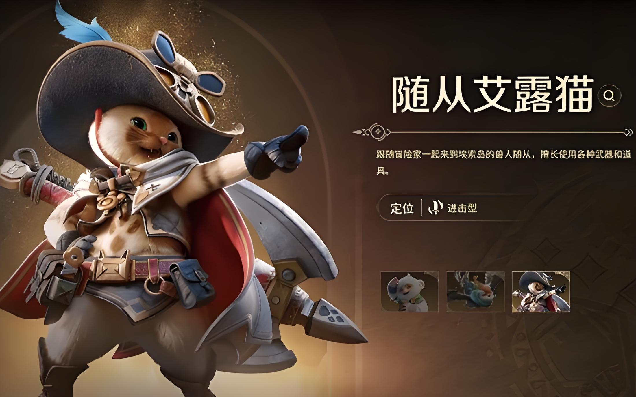 1、拟人化猫型随从,早期可解锁签约操控,属性偏敏捷辅助,具备独立行动逻辑,适合近距离配合玩家输出控场。
