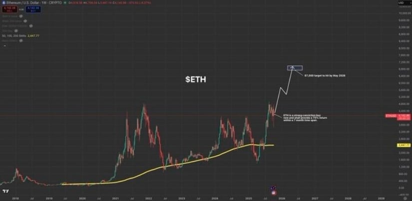 分析师指出,近期ETH价格回落至4000美元下方可能是最后一轮调整,随后将启动为期数月、目标7000美元的上涨行情,这预示着以太坊可能在2025年迎来突破性上涨