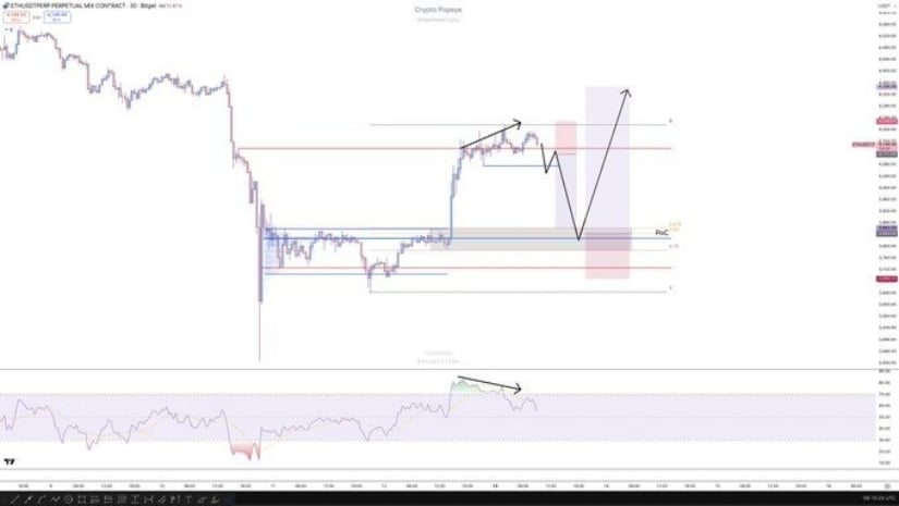 尽管宏观环境向好,交易员仍在关注短期回调信号。技术分析师@SailorManCrypto指出以太坊30分钟图呈现潜在三驱形态与顶背离:"当前形成三驱看跌形态,若价格回落至区间内并试图填补3900-4000美元区间FVG缺口,将触发做空信号。"