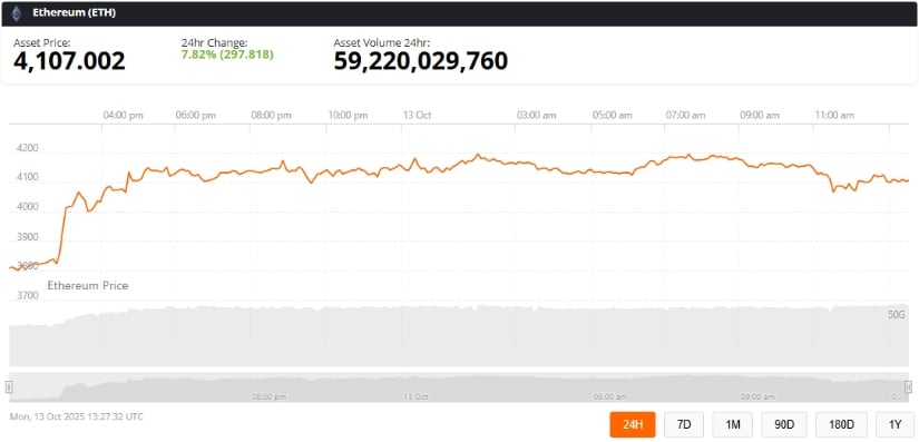 据Brave New Coin数据,以太坊价格已稳定在4100美元上方,日内涨幅7.8%,24小时交易量达592亿美元。虽然短期波动仍存,但随着机构持续吸筹和流动性压力转向多头,市场整体情绪偏多。