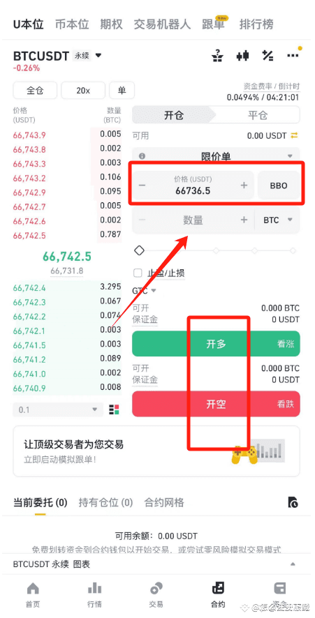 2.输入好委托价格,填写好下单数量,选择开多或者开空