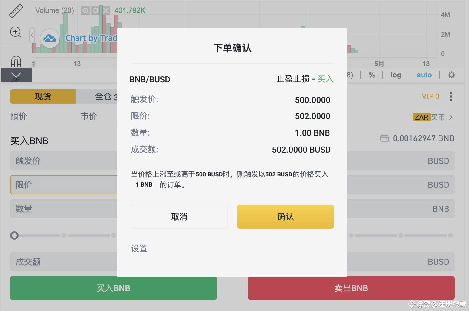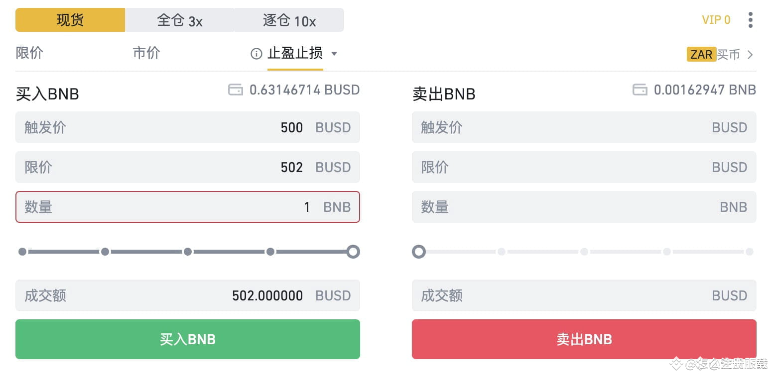 1.进入【现货交易】或者【合约交易】页面页面,选择【买入】或【卖出】,然后选择【止盈止损】。设置触发价500 BUSD,限价502 BUSD,输入您想要买入BNB的数量,点击【买入BNB】按钮。