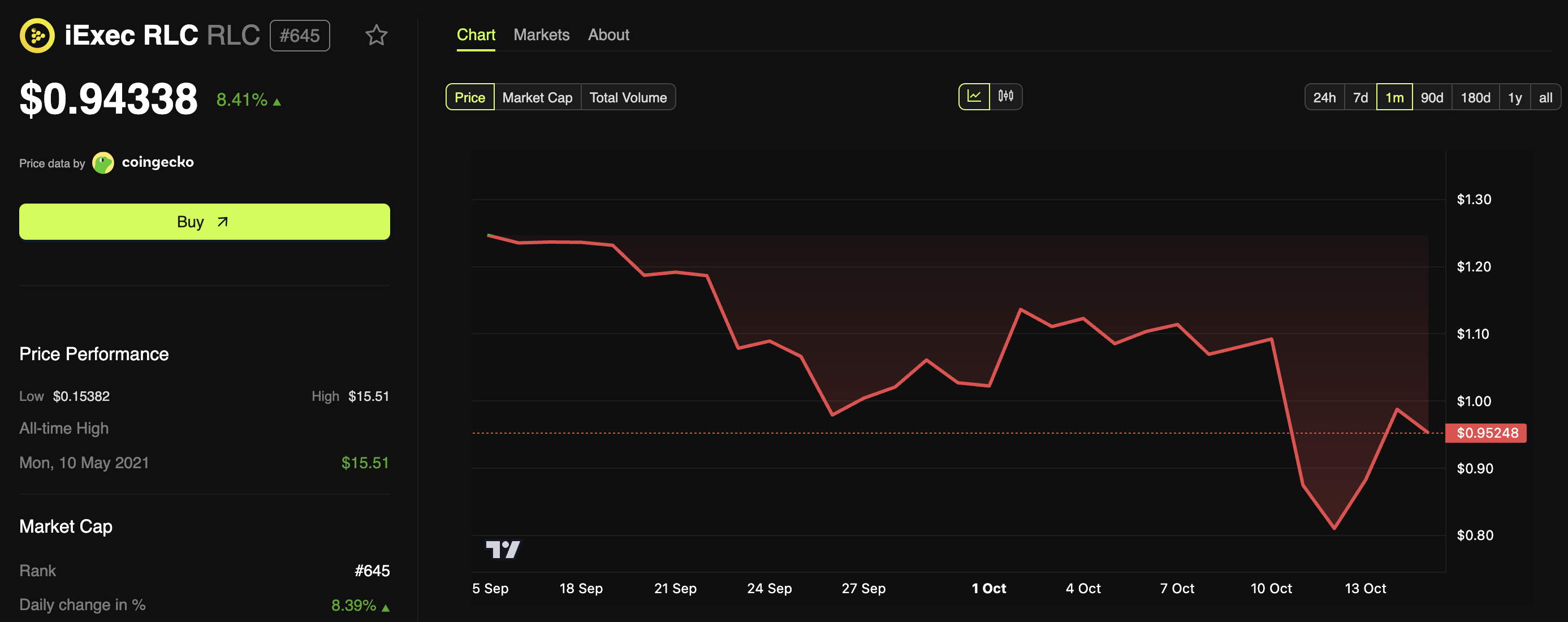 BeInCrypto数据显示,市值6830万美元的RLC近期获交易者热捧,日交易量暴增400%至3800万美元,币价单日上涨8.41%,现报0.94美元。