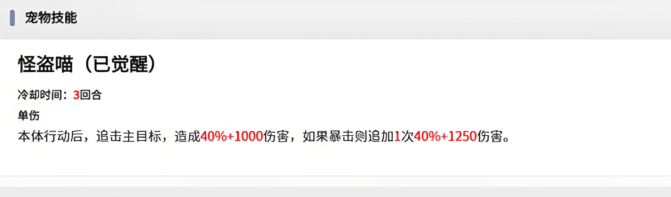 1、怪盗喵定位辅助型智壳,基础属性无突出点,核心能力是行动后追击主目标造成伤害,暴击时还会追加一次伤害。