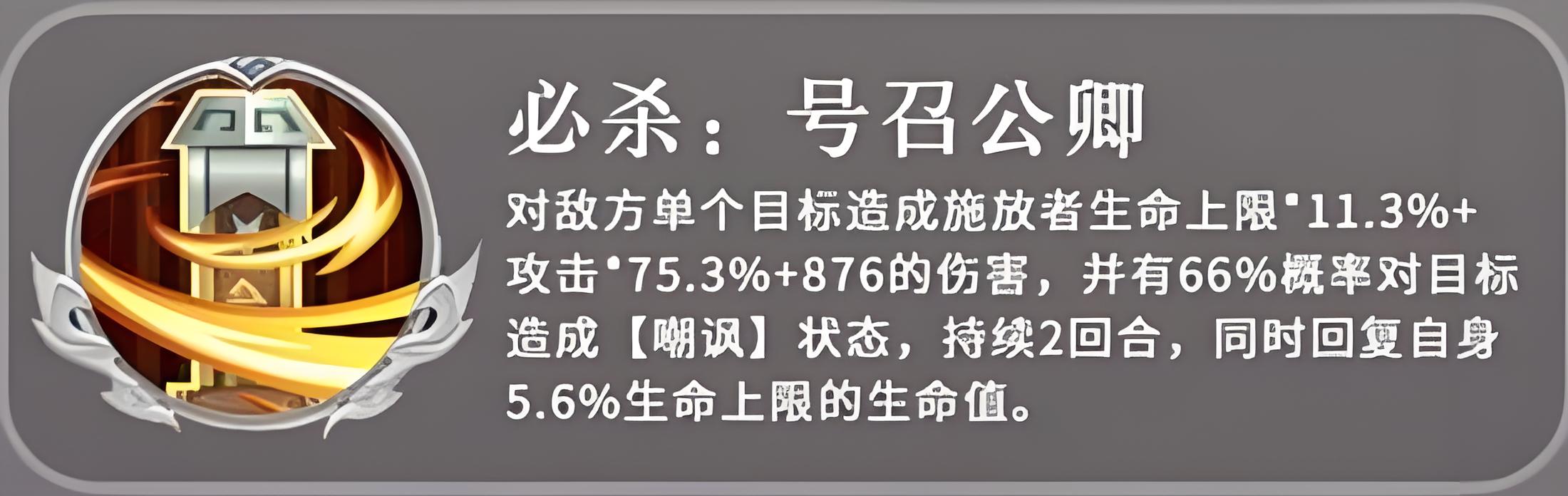 2、必杀技能对单个敌方造成生命上限11点3%攻击75点3%加876点固定伤害,66%概率施加嘲讽持续2回合,同时回复自身5点6%生命上限血量实现自我维持。