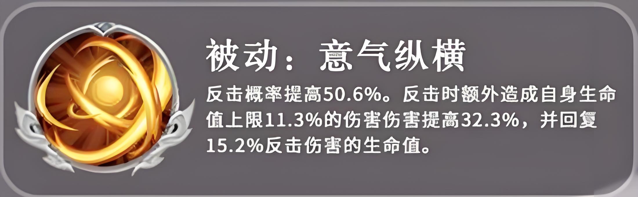 3、被动技能意气纵横让反击概率提高50点6%,反击时额外造成生命上限11点3%且增伤32点3%的伤害,还能回复15点2%反击伤害的生命值实现越打越硬。