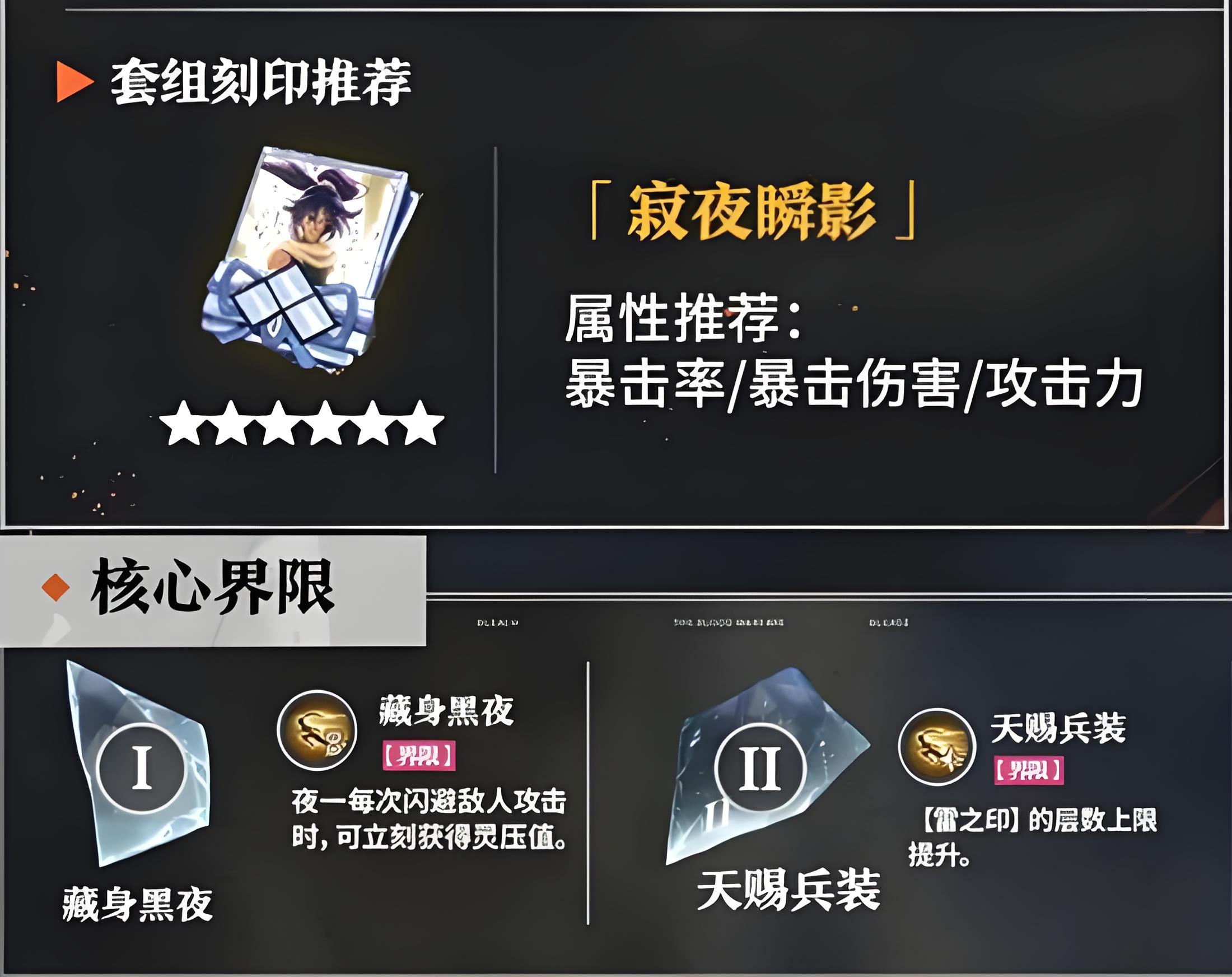 3、套装刻印推荐寂夜瞬影,激活后显著提升暴击伤害与暴击触发概率,贴合夜一依赖高频攻击与暴击叠加的输出方式,短时间打高额爆发。
