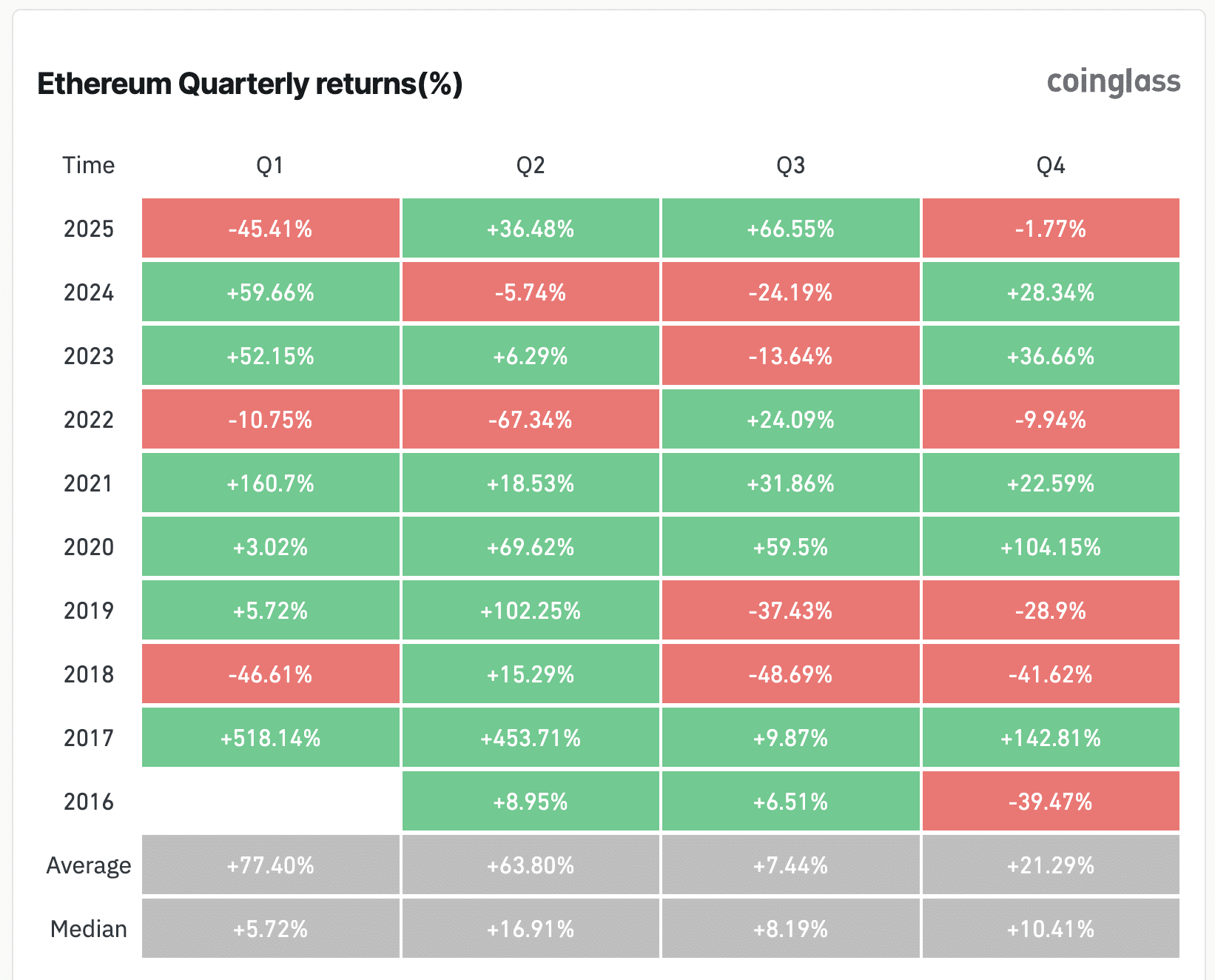 Lee甚至给出10,000-12,000美元的目标区间,称此为"价格发现"而非市场顶部。以当前4,000美元价位计算,10,000美元意味着150%的涨幅。但历史数据显示四季度平均回报率仅21%,按此推算ETH仅能触及5,000美元。以太坊在四季度从未实现过150%涨幅(2017年142.82%为最高纪录)。