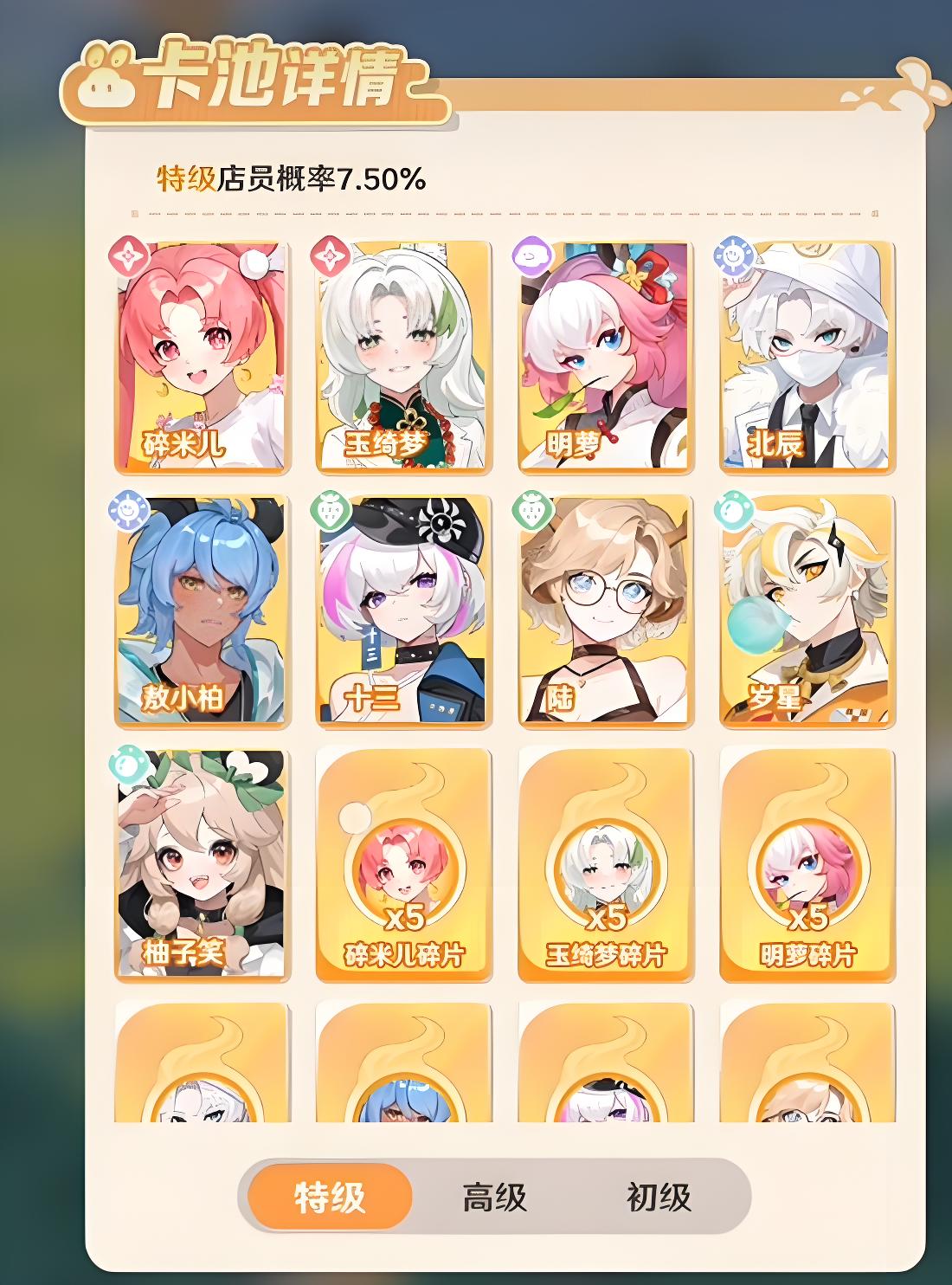 1、店员需通过抽卡获取碎片,集齐碎片合成完整角色,每个店员有不同专长,有的擅长接待顾客有的擅长加快菜品制作,需根据专长规划培养。