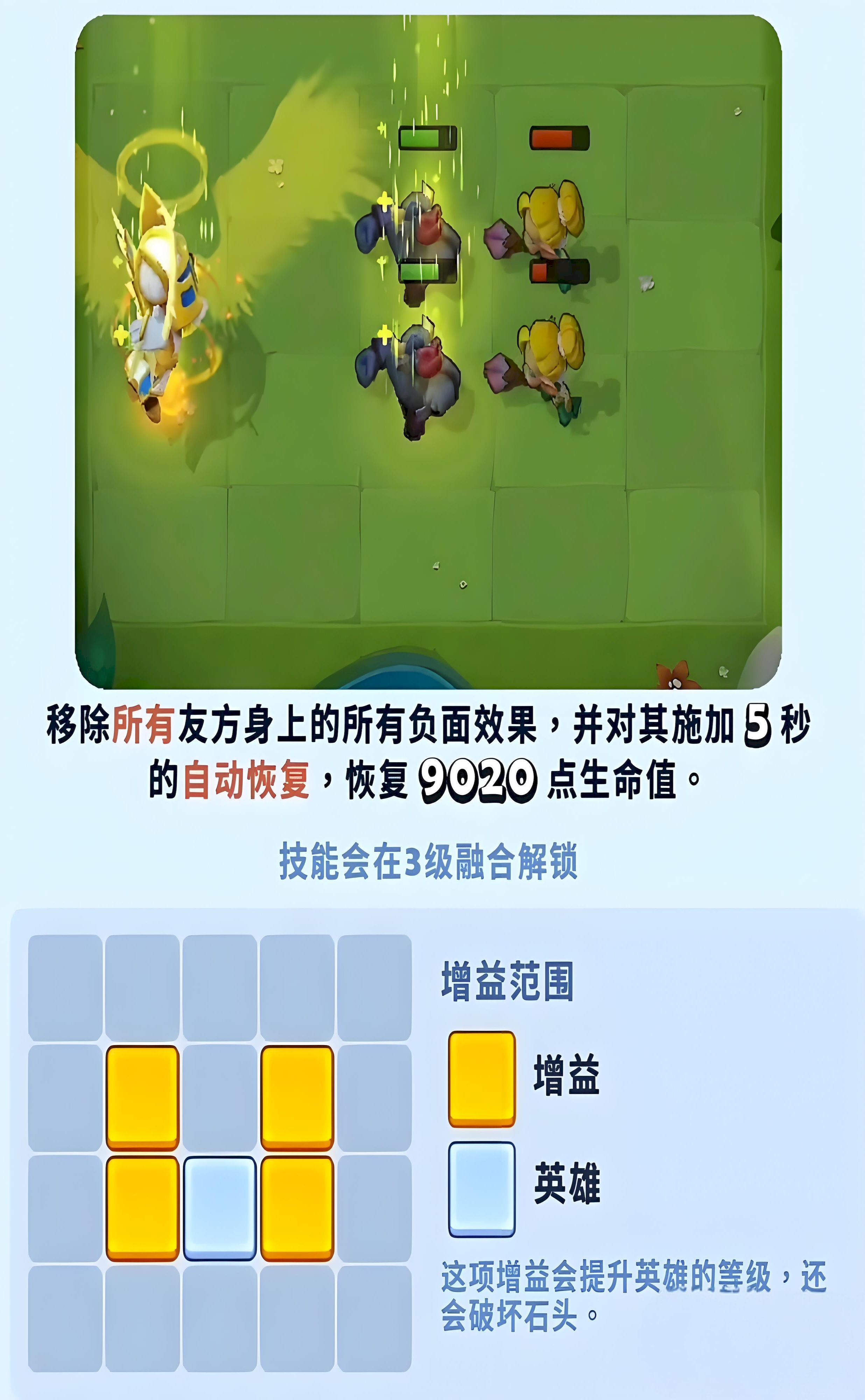 2、核心技能3级融合后解锁技能释放时移除所有友方负面效果,还为全体队友施加5秒自动恢复共恢复9020点生命值,对抗持续伤害对手时很实用。