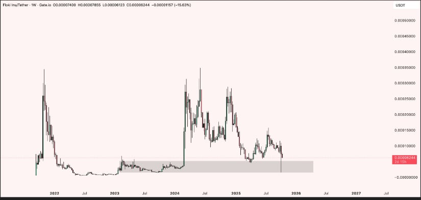 分析师指出,该代币已回归历史吸筹基底——这个区域曾多次标记周期底部。当前代币价格接近0.00006美元,与2023年和2024年初引发重大反弹的支撑区间完全重合。
