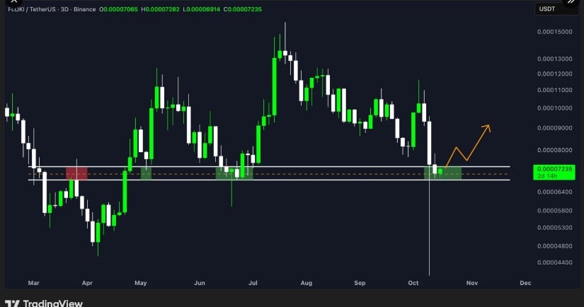 Crypto Anbu确认0.000072美元附近为强需求区,该区域曾在5月和7月引发看涨反转。随着交易者在最新回调后寻求重新入场,该水平持续吸引买方兴趣。
