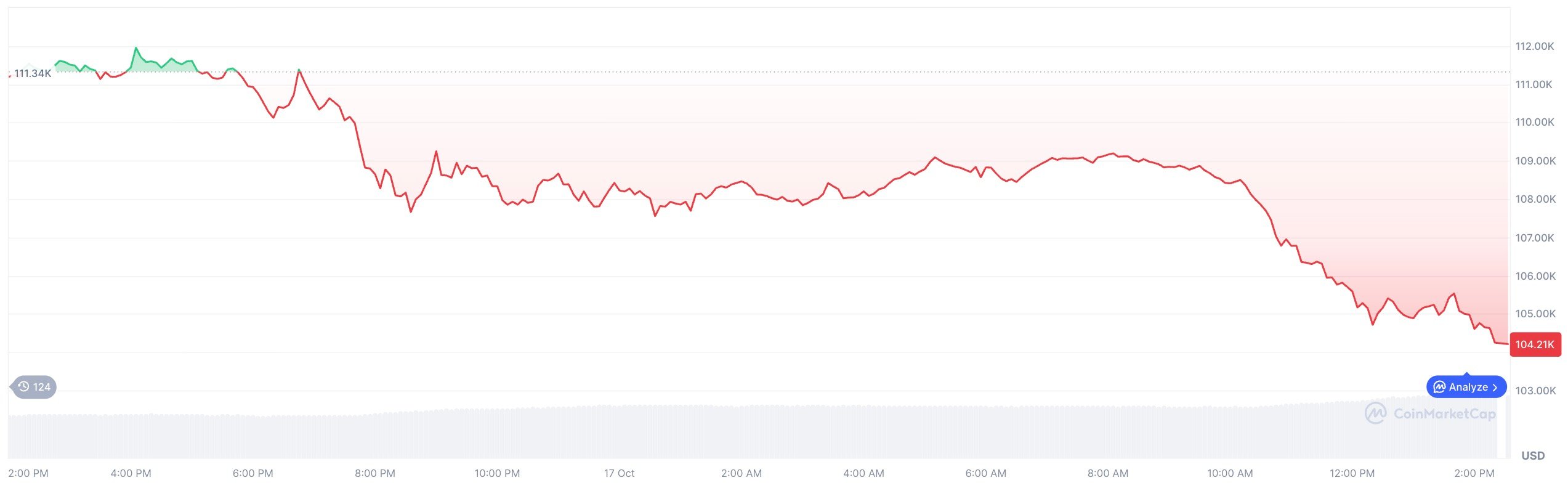 比特币现报104,625美元,周跌幅近9%,较两周前123,000美元高点回落近2万美元。这是自3月以来最大周阴线(当时BTC从98,000美元跌至82,000美元)。