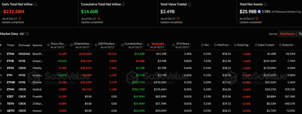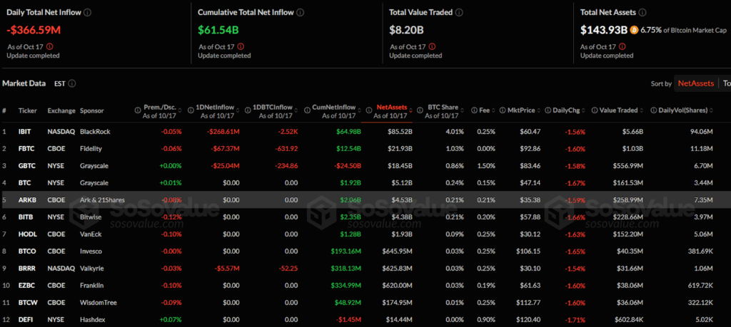 10月17日,比特币和以太坊ETF遭遇大规模资金外流,单日分别撤资3.66亿美元和2.32亿美元,尽管累计资金流入仍保持强劲。