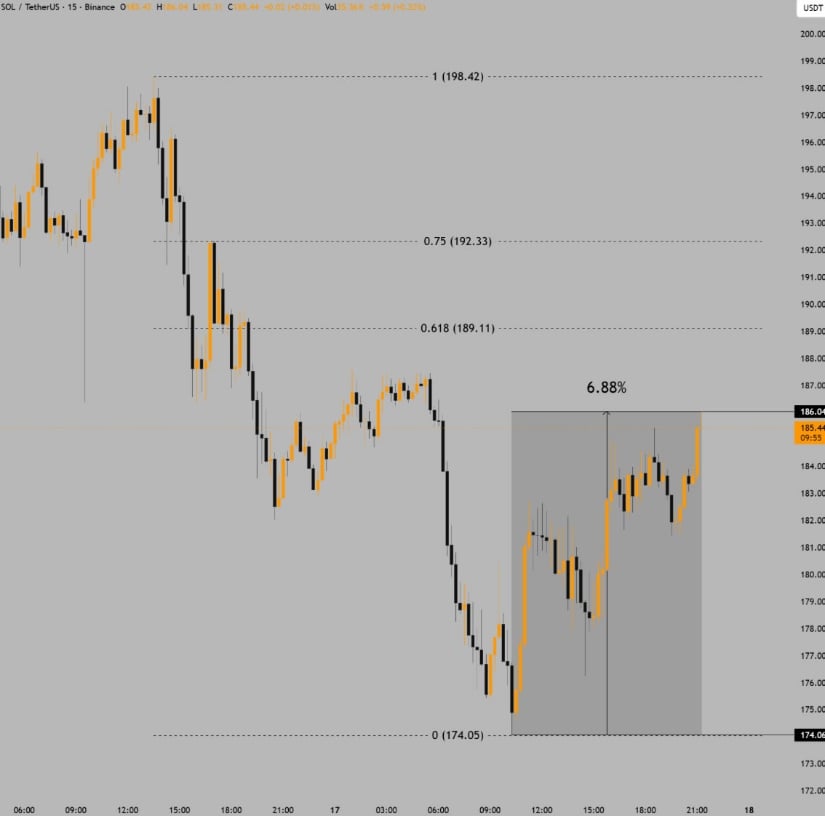 尽管近期存在回调压力,Solana价格仍从174至175美元支撑带强势反弹,形成明确的高位低点结构。ShangoTrades指出189美元和192美元将成为下一个关键阻力位,这些位置与0.618和0.75斐波那契回撤位重合。此次反弹出现在单日6-7%的强劲回升之后,表明买家正逐步重掌控制权。