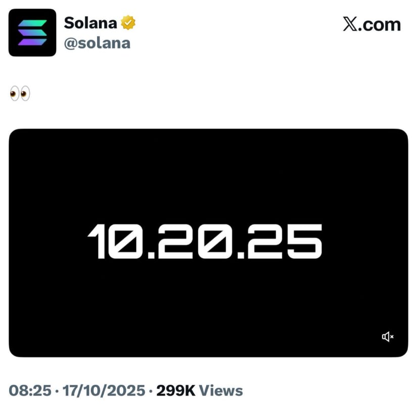 Solana预告10月20日重大公告,强化突破190美元关口的乐观预期。来源:Cointelegraph via X