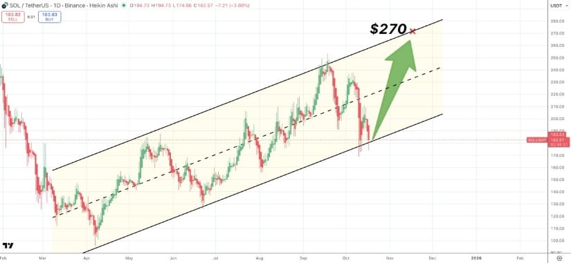 Solana维持上升通道形态,若170美元附近支撑稳固,有望向270美元进发。来源:Satoshi Flipper via X