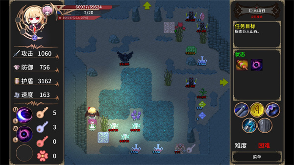(1)多用匿影:挑战的出装很烂,能力始终比正常游玩的状态下低一大截,因此该区域几乎全程都需要善用匿影来偷取强敌守着的宝石,偷了一些宝石就可以有一些弱怪用于补魔,回魔后就能偷更后面的强敌守着的宝石,因此前面四处魔力门都很值得开一开。玩家利用匿影能在前中期尽可能少打大战损的战斗,建议攒下至少80w+的血量用于最后几张非常烧血的BOSS站图。由于攻击会解除所有的匿影状态层数,因此一些有强怪守着宝石的支路可以不急着用匿影偷,而是优先走主路以激活各处的小站,这样处理能有效减少中期在匿影层数大于1时就用破影一击所导致的浪费。善用小站传送和仅剩1层匿影状态下的破影一击能减少很多魔力消耗。