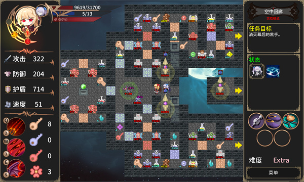 (2)道具用法:在这个区域中玩家必须合理地使用关键道具破墙镐和红钥匙才有可能通关。处理这种魔塔有几个常用的策略:第一个策略“稳扎稳打”就是简单地利用道具打开必开的红门,破必破的墙来拿里面的大宝石等,利用道具将每个小区域都搜刮得差不多再往后打;而另一个很常用的策略则是“偷高层”,其含义是利用手头的关键道具,绕掉挡路强敌,提早来到怪物相对于自己更强的高层(后面的)区域并拿到更多的能力,因为越往后虽然怪物越强但宝石往往也越多,之后就能以更小的代价清理之前的楼层。当前区域需要采用哪种策略就需要玩家多探路多分析了,这类魔塔玩多了自然就有心得了。