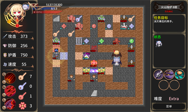 7654F一路咸下去直到3F;3F破右上蓝门上面的墙,这样不仅绕掉了当前不好处理的左侧,同时日后清理这层的代价也更低;炼金塔顶层拿1破,回廊3卖血拿下方的红;2F凑魔清理主路的2火焰幽魂和1红骑士,然后破龙前面红门左右两侧的墙,拿第一枚冰冻徽章;1F开上面的蓝门,再利用小站传送机制就能绕掉下方的追猎怪;熔炉外下部开红拿第二枚冰冻徽章。之后就是往返清理回廊和熔炉,这个时候回廊的立方体就不难打了,处理它后就可以处理同层的弱怪,利用打弱怪回的魔来处理火山守大宝石的强怪。直到红宝石基本拿完后,凑近5w血打炼金塔顶的BOSS,之后清场。