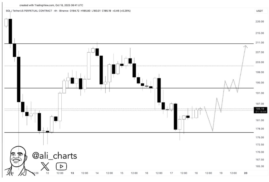 分析师Ali表示,Solana($SOL)将反弹至210美元水平。他的图表显示,SOL在178-180美元区间内存在强劲支撑位,该支撑位充当了看涨反转的基础。预期走势意味着短期复苏,190美元附近的盘整将成为下一轮上涨的跳板。