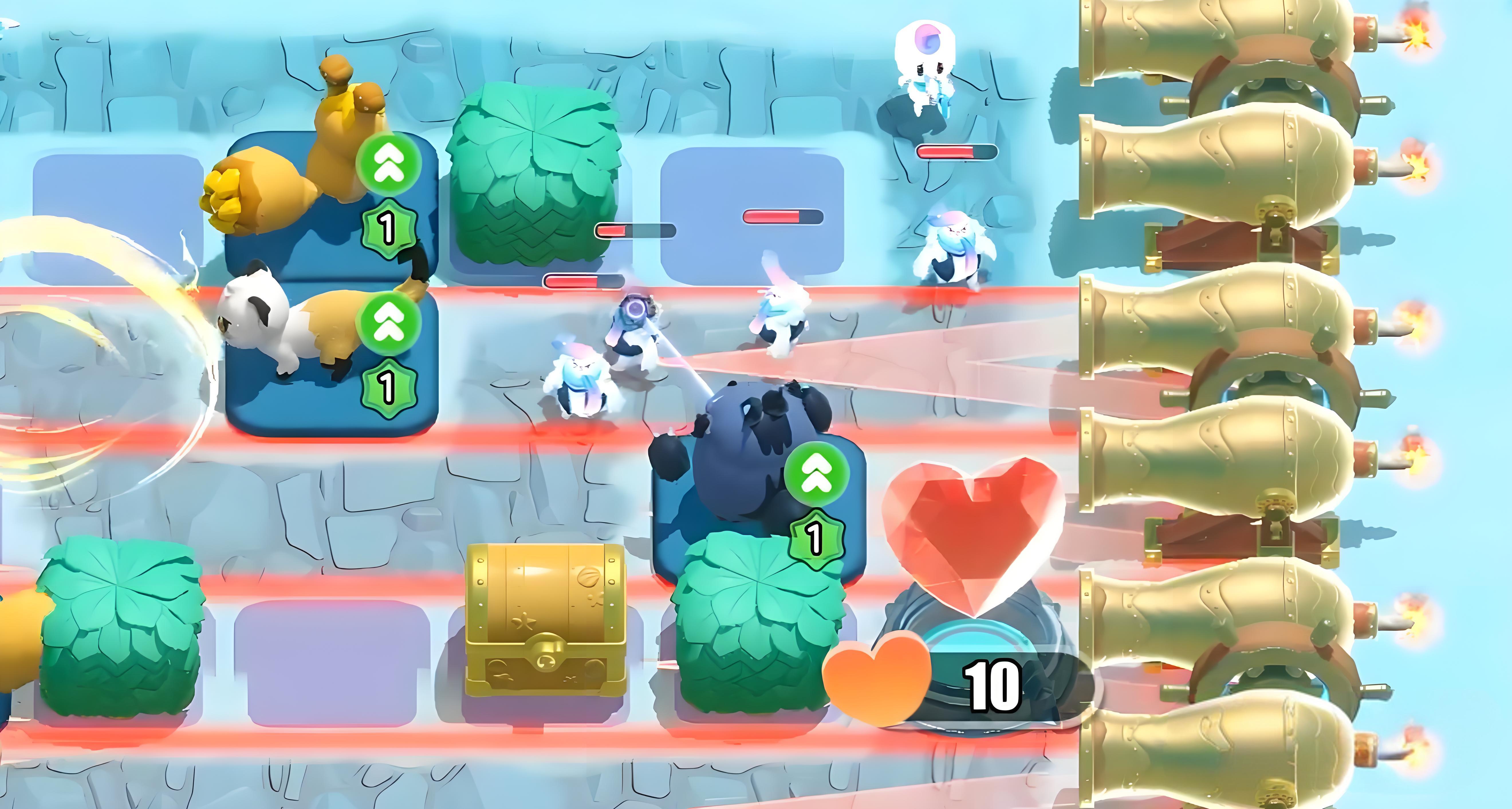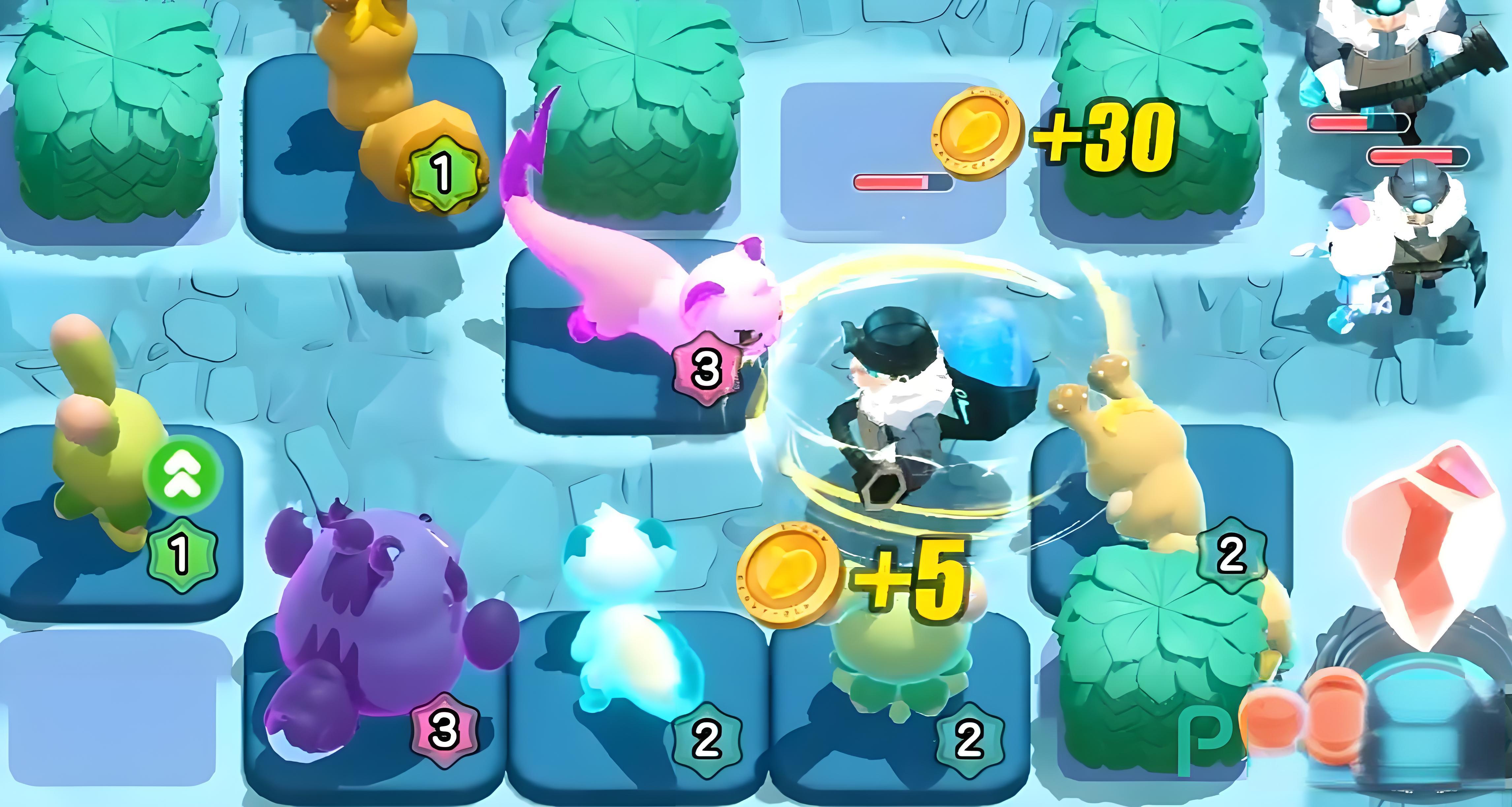 3、正式对局中怪物从传送门进入地图,每关需攻击指定数量怪物,玩家依地形布置艾比或用技能,解锁障碍物和宝箱获取金币与塔基。