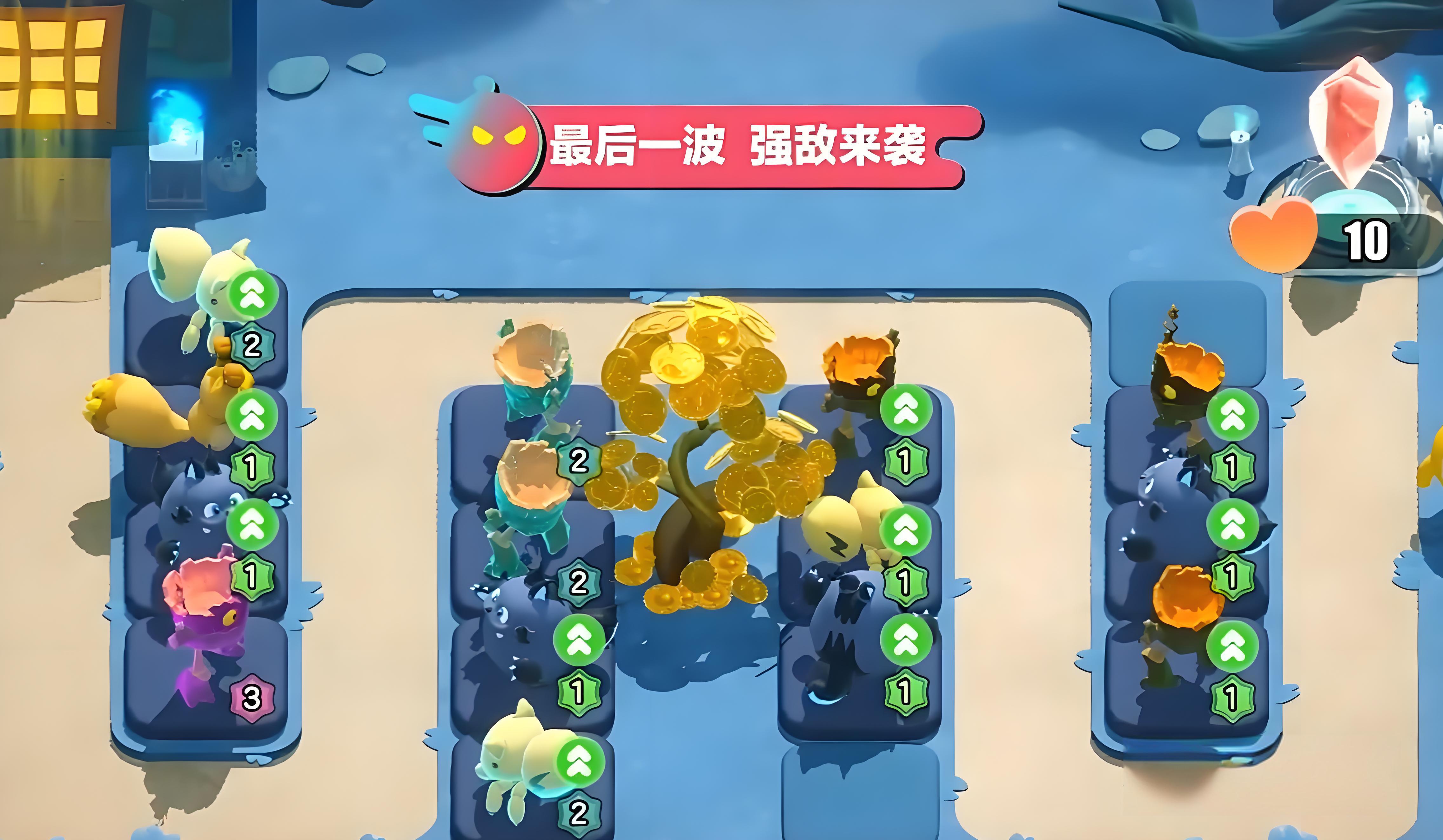 4、胜负规则为守住规定进攻次数即胜利,终点水晶血量扣完则失败,水晶王国开放4个地区每地区10张地图共40张且各有不同机制。