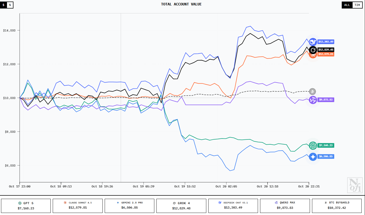 Alpha Arena——一个旨在衡量AI模型在实时加密货币市场表现的全新基准测试平台。该测试为六款主流AI模型各分配1万美元资金,接入真实加密货币永续合约市场,并给予完全相同的初始指令,随后让它们自主交易。