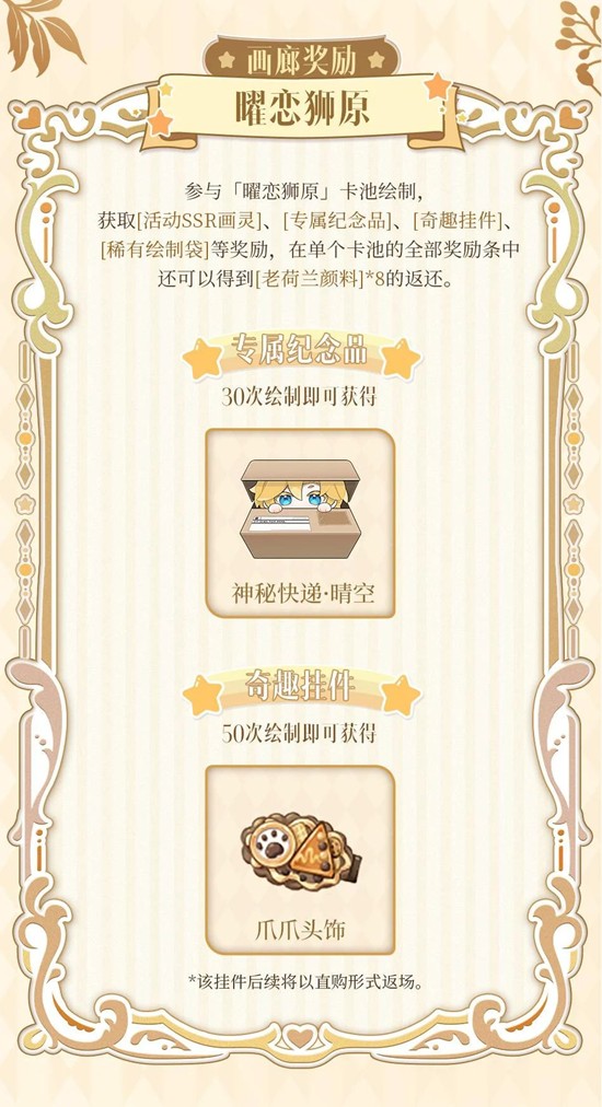 1、活动画廊恋恋奇踪曜恋狮原限时开启,参与卡池绘制可获取活动SSR画灵、神秘快递、奇趣挂件等物品,单个卡池领取完全部奖励条还返老荷兰颜料。