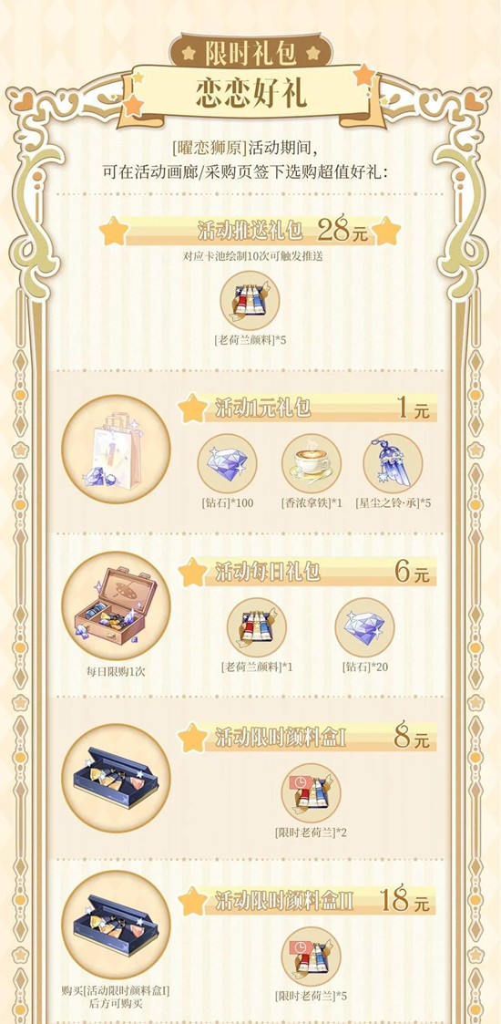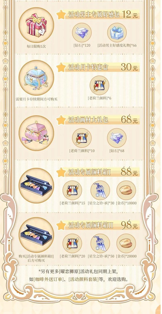 4、活动还包含不同价位的限时颜料盒、每日礼包、男主专属好感包等,部分礼包需先购买前置礼包或满足月卡存续状态这两个条件中的一个才能购买。