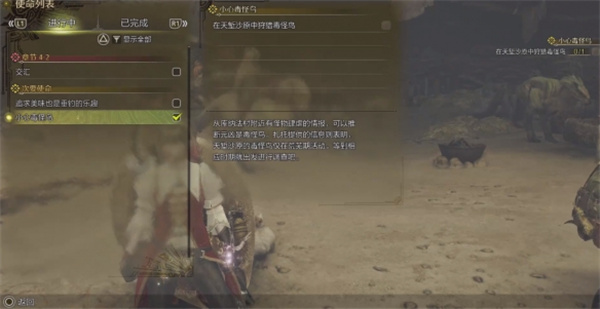 1、接取小心毒怪鸟的任务,扎托会提示天堑沙原的毒怪鸟仅在荒芜期活动。