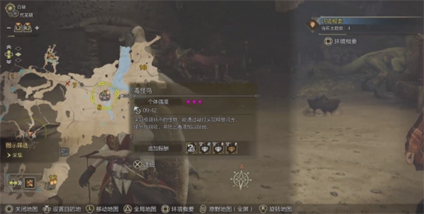 2、进入个人营地,休息,将华景调整成荒芜期,时间推荐早晨黄昏,打开地图,找到毒怪鸟的位置,设置为目的地。